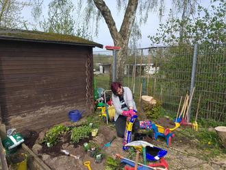 Auf dem Kindergartengelände wurde emsig geholfen. Im Sinnesgarten wurden die Spuren vom Winter beseitigt. Die Kräuterspirale freut sich nun über verschiedene neue Kräuter und die Beete wurden mit unterschiedlichen Kulturen neu angelegt. So steht unserer neuen Gartensaison nichts mehr im Wege. Wo Väter noch mit dem Sandschaufeln beschäftigt waren, da haben die Mamas unsere Fenster geputzt, getreu dem Motto: Viele Hände schaffen ein schnelles Ende.
