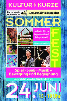 „Kultur für Kurze“ geht dieses Jahr in die zweite Runde. Wir freuen uns, Groß und Klein am 24.6.2023 um 15-19 Uhr im Stall.dich.ein in Poppendorf zu begrüßen. Genießt die Zeit für gemütliches Zusammensein, Musik zu lauschen, zu spielen, zu basteln und zu schlemmen. Kommt zusammen und bringt die Sonne mit!