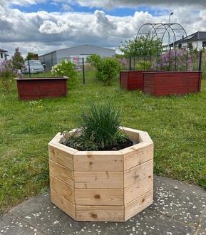 Die Hochbeete und Pflanzkübel haben unsere Kleinsten bepflanzt. Kräuter wie Schnittlauch und Petersilie sowie Erdbeeren und auch Gurken haben in unserem Entdeckergarten einen schönen Platz gefunden.