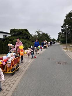 Auch in diesem Jahr haben wir den Kindertag für unsere Kinder der Einrichtung besonders gefeiert. Die Kinder stehen täglich im Mittelpunkt unserer Arbeit, aber an diesem Tag soll es für jeden besonders ersichtlich sein. Mit bunt geschmückten Stöckchen voller Luftballons, Bänder und Trillerpfeifen sind alle Kinder unserer Kindertagesstätte durch Broderstorf spaziert. Eine bunte „Schlange“ aus vielen fröhlichen Kindern zog durchs Dorf. Und wir hatten ein tolles Ziel: wie jedes Jahr durften wir auch diesmal in der „Mooreiche“ einkehren. Frau Gründer hat die Kinder der Krippe und des Kindergartens zum Eisessen eingeladen. Dafür möchten wir uns bei Frau Gründer und dem gesamten Team der „Mooreiche“ herzlich bedanken.