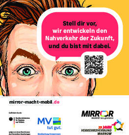 Aus deutschlandweit über 160 Bewerbungen hat das Bundesministerium für Digitales und Verkehr (BMDV) den Verkehrsverbund Warnow (VVW) zusammen mit den Verkehrsunternehmen und weiteren Beteiligten zur Umsetzung des Modellprojektes MIRROR ausgewählt. Die Hanse- und Universitätsstadt Rostock und der Landkreis Rostock werden damit zu einer Modellregion für den Öffentlichen Personennahverkehr (ÖPNV).