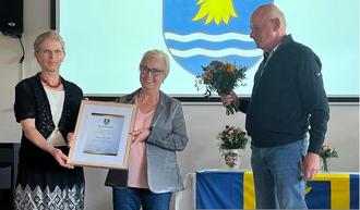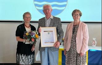 Uschi Noak mit dem Laudator Herrn Joachim Jesse, langjähriger Gemeindevertreter in Broderstorf und der Bürgermeisterin.