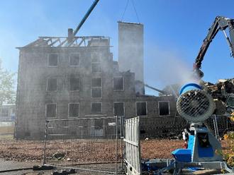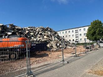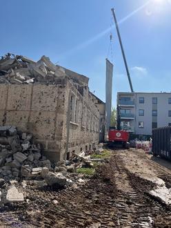 Nachdem im letzten Jahr der neue Wohnblock bezogen werden konnte, begann im Frühjahr der Rückbau des leeren Gebäudes. Über Wochen wurden die Materialien im Innenbereich abgebaut, separiert und abgefahren und jetzt wird die Außenhülle zerkleinert und entsorgt.