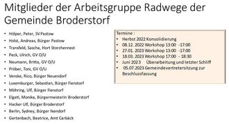 In intensiven Beratungen und detaillierten Datensammlungen haben die Mitstreiter der Arbeitsgruppe Radwege ihr Konzept fertiggestellt und wollen es in der Gemeindevertretersitzung am 05.07.2023 vorstellen und beschließen lassen. Dabei wurden Straßen, Feld- und Wanderwege analysiert und kategorisiert, Abstellstationen für Fahrräder vorgeschlagen und auf Sehenswürdigkeiten in unserem nahen Umfeld aufmerksam gemacht. Hier ein kleiner Auszug…