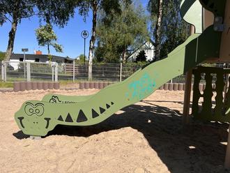 Mitte Mai mussten wir leider feststellen, dass unsere Rutsche des neuen Klettergerüstes BESCHMIERT wurde. Wir sind sehr traurig und auch verärgert deswegen, denn lange mussten wir darauf warten, bis unser neues Spielgerät dank des Amtes Carbäk einsatzbereit war.