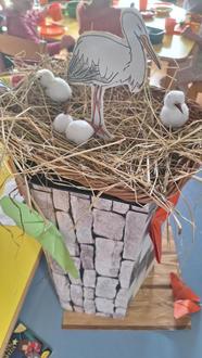 Wir malten und bastelten in dieser Zeit zum Thema und bauten ein eigenes Storchennest auf unserem Tisch. Langsam vergrößerte sich das Nest, denn die Jungtiere brauchten Platz. Täglich beobachteten wir die Fütterung durch die Eltern.