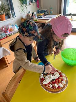 Alle Kinder lernten das Lied „Auf unserer Wiese gehet was“ und auch die Geschichte vom „Fuchs und dem Storch“ begleitete unseren Tagesablauf. Mit einer „Storchen-Party“ samt selbstgestalteter Torte - ratet mal, was darauf zu sehen war - endete unser Projekt.