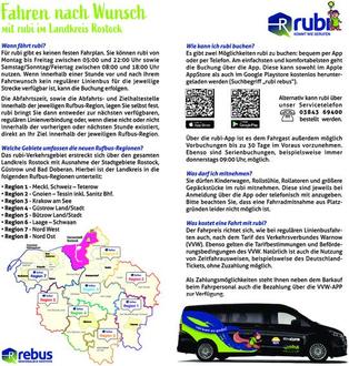 Weitergehende Informationen können dem nachfolgenden REBUS-Flyer "Fahren nach Wunsch - mit rubi im LK Rostock" entnommen werden. Ebenfalls wird auf der Homepage unter www.rebus.de über rubi informiert.