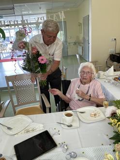 Beim Frühstück mit der Vereinsvorsitzenden Frau Dr. Palis, der Geschäftsführerin Frau Kowitz, der Heimleiterin Frau Noß und einigen aus dem Team, soweit sie denn abkömmlich waren, gab es nach den warmen Gratulationen auch noch Interessantes zu plaudern. Herr Dr. Fleischer überbrachte in schönen Worten die besten Wünsche des Heimbeirates. Ab und zu wurde auch aus den Augenwinkeln nach der Eingangstür geblickt, ob vielleicht noch Prominente kommen. Um 10:00 Uhr gab es den Höhepunkt des Tages: Dreißig - oder mehr - kleine Sänger mit Gitarrenbegleitung durch ihre Betreuerinnen sangen im Chor „Weil du heute Geburtstag hast …“ und noch weitere Ständchen. Und sie brachten sogar noch eine Rose für Omas Terrasse mit, die der Gärtner gleich eingepflanzt hat.
