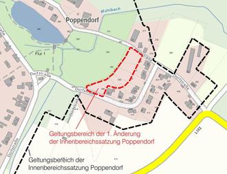 Die 1. Änderung der „Satzung der Gemeinde Poppendorf über die Klarstellung der Grenzen des im Zusammenhang bebauten Ortsteils (§ 34 Abs. 4 Satz 1 Nr. 1 BauGB) und die Ergänzung dieses Gebiets durch Einbeziehung einzelner Außenbereichsflächen (§ 34 Abs. 4 Satz 1 Nr. 3 BauGB)“ für den Ortsteil Poppendorf der Gemeinde Poppendorf (Innenbereichssatzung) wird hiermit ortsüblich bekannt gemacht.