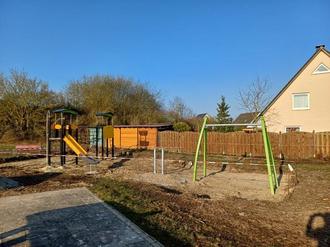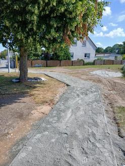 Vor dem Dörphus in Steinfeld wird die Pflasterfläche für eine geordnete Regenentwässerung hergerichtet und der Parkplatz am Friedhof in Steinfeld wird neu profiliert für eine Entwässerung, die Wertstoffcontainer bekommen eine gepflasterte Aufstellfläche noch in diesem Jahr.