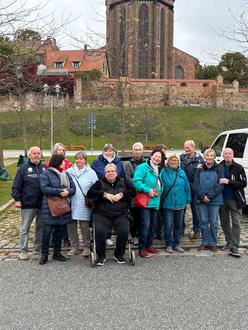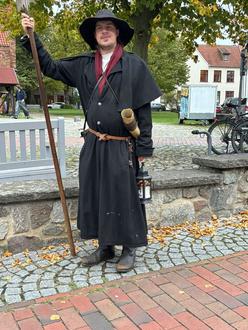 Am 08.10.2025 führten wir eine Nachtwanderung in der Altstadt von Rostock durch. Mit privaten Autos fuhren wir zum PP unterhalb der Petrikirche. „Hört Ihr Leut‘ und lasst Euch sagen ..." - mit diesem Ruf beginnt der Rostocker Nachtwächter seinen Rundgang. Standesgemäß gekleidet mit Umhang, Hellebarde und Signalhorn berichtet er von liederlichen Dirnen, Bönhasen, unehrlichen Leuten und vielem mehr. Währenddessen führt er uns durch Rostocks ältesten Stadtteil - die östliche Altstadt. Die Nachtwächterführung ist für alle Altersklassen geeignet. Beginn war an der Petrikirche. In den 1,5 Stunden haben wir unglaublich viel über die Stadtgeschichte, alte Namensgebungen sowie die Aufgaben und Kleidung der Nachtwächter erfahren. Sven, unser Nachtwächter, hat die Führung mit einer tollen Mischung aus Humor, Wissen und spannenden Geschichten gestaltet. Besonders beeindruckend war, wie er historische Themen mit aktuellen Bezügen - Stichwort: Panorama - Stadtmauer verbunden hat. Auch kleine Showeinlagen, wie die traditionelle Stundenansage mit Hornblasen, machten die Tour zu einem echten Erlebnis. Es war eine hervorragende Führung, sehr kompetent, stimmgewaltig, redegewandt, humorvoll und für jede Frage offen.