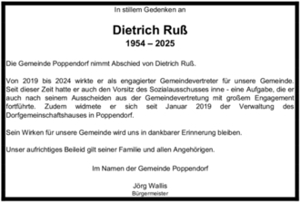 Die Gemeinde Poppendorf nimmt Abschied von Dietrich Ruß. Von 2019 bis 2024 wirkte er als engagierter Gemeindevertreter für unsere Gemeinde. Seit dieser Zeit hatte er auch den Vorsitz des Sozialausschusses inne - eine Aufgabe, die er auch nach seinem Ausscheiden aus der Gemeindevertretung mit großem Engagement fortführte. Zudem widmete er sich seit Januar 2019 der Verwaltung des Dorfgemeinschaftshauses in Poppendorf. Sein Wirken für unsere Gemeinde wird uns in dankbarer Erinnerung bleiben. Unser aufrichtiges Beileid gilt seiner Familie und allen Angehörigen.