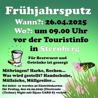 Auch in diesem Jahr werden wieder viele fleißige Hände benötigt. Zum Landesrapsblütenfest 2025 ruft der Ausschuss für Tourismus, Kultur, Umwelt und Ordnung der Stadt Sternberg zum großen Frühjahrsputz auf. Wir wollen wieder gemeinsam für eine saubere Stadt und Ortsteile sorgen. Am 26. April 2025 sind alle Bürger, Vereine, Initiativen und Einrichtungen dazu aufgerufen, dem Winterschmutz zu Leibe zu rücken. Der Bauhof wird an diesem Tag diese Aktion tatkräftig unterstützen.