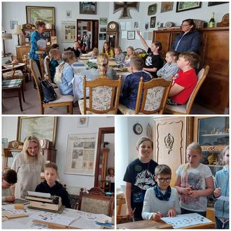 Begeistert waren sie natürlich auch beim Ausprobieren: auf dem großen Tisch, der über 100 Jahre alt ist, fanden sie viele Schiefertafeln mit Griffeln, alte Schreibmaschinen, über 60 Jahre alt, und Federhalter und Tinte. Das Schreiben machte ihnen natürlich viel Spaß. Beim Schreiben mit Federhalter und Tinte waren die Finger schon mal blau und Tintenkleckse gab es auch.