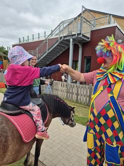 Die Kinder konnten es kaum erwarten und freuten sich sichtlich über die schöne lila Hüpfburg vom Hüpfburgcenter Sternberg und über unsere Ponys Conni und Bambina vom „Sams Therapie- und Reiterlebnishof“. „Clown Bandi“ begeisterte mit seinen lustigen Ballonfiguren und auch beim Kinderschminken wurden keine Wünsche offengelassen. In der Kinderdisko konnten dann alle „Tiger, Feen, Dinosaurier und Katzen“ noch gemeinsam im schillerndem Seifenblasen- Regen das Tanzbein schwingen. Zum krönenden Abschluss des Festes gab es für alle Kinder ein leckeres Eis, das vom Elternrat gesponsert wurde und dank Tobi und unserem Küchenteam ein selbstgewähltes „Wunsch-Mittagessen“! Was für ein schöner Tag mit viel Lachen und glücklichen Gesichtern! Danke, liebe Eltern, dass Sie durch Ihre Unterstützung diesen Tag so einzigartig gemacht haben und dass Sie mit den neuen Möglichkeiten zum Spielen und Entdecken unsere Kita mit schönen Dingen auch dauerhaft bereichert haben!