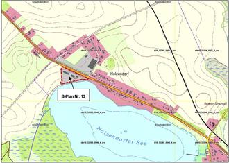 Der Geltungsbereich des Bebauungsplans Nr. 13 befindet sich am westlichen Ortstrand des im Zusammenhang bebauten Ortsteils Holzendorf zwischen der Bundesstraße B192 im Norden und dem südlich angrenzenden Holzendorfer See (siehe Übersichtskarte). Der Geltungsbereich beschreibt im Wesentlichen den Standort eines ehemaligen Fernmeldeamtes und umfasst hier die Flurstücke 148, 149/1, 149/2, 149/3, 149/4, 149/5, 149/6 sowie im Südwesten eine kleine Teilfläche des Flurstücks 186. Alle Flurstücke befinden sich in der Flur 3 der Gemarkung Holzendorf bei Dabel.