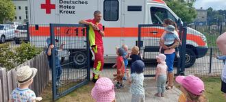 Alles drehte sich an diesem Vormittag mit spielerischen und interessanten Aktionen rund um das DRK, anlässlich des Weltrotkreuztages. Bei schönstem Sonnenschein und Sommerwetter fanden sich morgens alle Kinder auf unserem Spielplatz um ein großes buntes Schwungtuch zu einem Morgenkreis zusammen. Alle Aktionen wurden von den Erzieherinnen vorgestellt und ein eigenes erfasstes Lied über das DRK wurde gesungen.