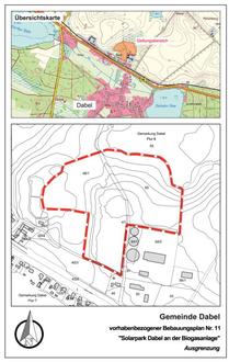 Die Gemeindevertretung der Gemeinde Dabel hat in der Sitzung am 16.05.2024 den Planentwurf des vorhabenbezogenen Bebauungsplans Nr. 11 „Solarpark Dabel an der Biogasanlage“ in der Fassung vom Februar 2024 beschlossen.