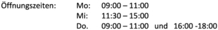| Öffnungszeiten: | Mo: | 09:00 - 11:00 |