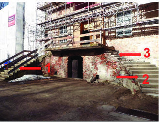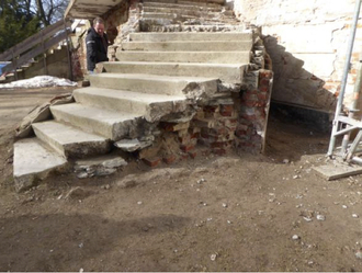 Die Untersuchung der Treppe erfolgte durch den Restaurator. Er stellte fest, dass die freigelegten Betonstufen (2) noch die ursprüngliche geschwungene Treppenform haben.