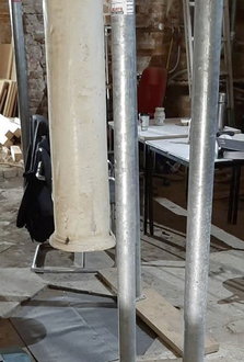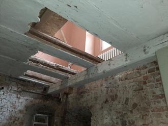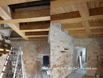 Alle Balken mussten ausgetauscht werden, die Lehmwickel wurden entfernt und es begann ein totaler Neuaufbau des Fußbodens. Dazu gehörte auch die Überprüfung der Stützpfeiler im Keller.