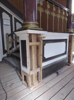 Der Restaurator stellte fest, dass die äußere Treppenwange offensichtlich erneuert wurde, da kein Verbund zum barocken Unterbau vorhanden ist.
