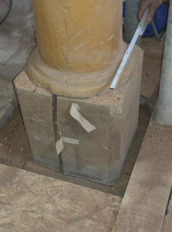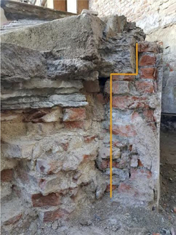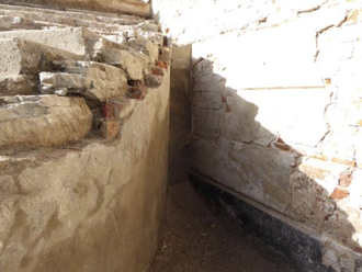 Nach Entfernen des Schutts aus dem Zwickel zur Fassade wurde der alte Sockelputz sichtbar.