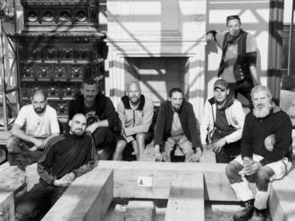 Die auf dem Foto abgebildeten Handwerker haben die Abbrucharbeiten, die anfallenden Maurerarbeiten und sämtliche Holzarbeiten ausgeführt. Sie reparierten die Balkenköpfe, tauschten die maroden Balken im Dachgeschoß, entfernten die Balkenlager im Grünen Salon und Foyer.