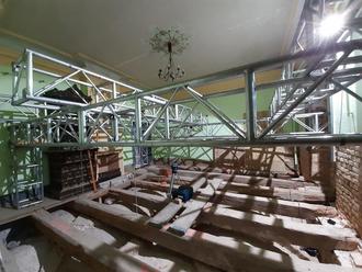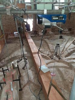Auf dem ersten Foto sehen Sie etwas von der eingesetzten Technik. Sie hätte auch bei einer Open-Air-Veranstaltung eingesetzt werden können, denn von einem Event-Technik-Unternehmen wurde sie ausgeliehen. Auf diesem Bild sehen sie das alte Balkenwerk, was in seiner Gesamtheit gewechselt werden musste.