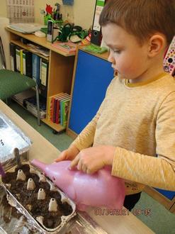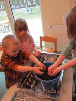 Endlich Frühling! Auch bei uns in der Kita hat die Gartensaison begonnen. Vor einigen Wochen schon haben wir die ersten Samen in die Erde gelegt, um später die kleinen Pflanzen in unsere Hochbeete pflanzen zu können. Naja, und wie das so ist mit Samen und Pflanzen… sie müssen gepflegt werden, und wenn sie nicht regelmäßig gegossen werden, kann es schon mal passieren, dass nichts wächst oder die kleinen Sprösslinge ihre Köpfe hängen lassen. Eine Erfahrung, die die Kinder unserer Vorschulgruppe auch gemacht haben. Aber zum Glück gibt es liebe Eltern und Freunde der Kita, die uns aus dem Baumarkt und aus dem eigenen Garten richtig schöne Jungpflanzen mitgebracht haben, so dass in unseren Beeten jetzt Erdbeeren, Kohlrabi, Salat, Pfefferminze, Blumenkohl und Petersilie wachsen. Radieschen und Kapuzinerkresse haben wir direkt ausgesät. Auch hier wachsen die ersten kleinen Pflanzen. Wir sind schon gespannt, wann wir die ersten Radieschen ernten können. Jetzt ist noch ein wenig Platz für die Möhren, die wir noch aussäen werden. Ein Hochbeet haben wir für Blumen reserviert. Bunte Sommerblumen sollen Schmetterlinge und andere Insekten anlocken, damit wir sie beobachten können. An der Tomatenpflanze lassen sich die ersten Blüten sehen. Kaum zu glauben, dass aus kleinen gelben Blüten runde rote Tomaten werden. Welch eine Überraschung! An der Zucchini-Pflanze ist schon ein kleiner grüner Zucchino* zu erkennen. Petersilie haben wir sogar schon verkostet. Der herbe Geschmack ist nicht jedermanns Sache. Einig waren sich die Kinder, dass die Pfefferminzblätter sehr gut riechen - wie Kaugummi -, wenn man sie zwischen den Fingern verreibt. Daraus werden wir leckeren Tee kochen und diesen dann im Sommer, wenn es richtig warm draußen ist, gut gekühlt als Erfrischung genießen. Darauf freuen wir uns schon! Doch jetzt müssen wir die Pflanzen in den Hochbeeten gut pflegen, regelmäßig gießen, Unkraut zupfen und einfach nur warten …