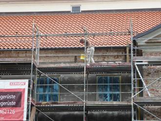 Der Westflügel des Schlosses hat ja schon längere Zeit seine neuen Fenster. Dies war aber durch die Gerüstplanen nicht sichtbar. Mit der Fertigstellung der beiden Ecksteine an der Südwest- und Nordwestseite konnten dort die Dachflächen geschlossen werden und dem Wiederanbau der Dachrinnen stand nichts mehr im Wege. Mit diesen Arbeiten war die Baufreiheit für die Putzarbeiten an der Fassade gegeben … und nun ist der Grundputz drauf.