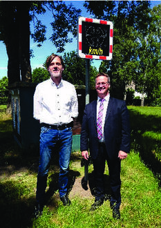 Bürgermeister Alexander Benkert und Teilsponsor Jörg Marten vor dem Verkehrsdisplay in Kandelin