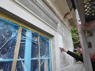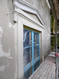 Im Juli habe ich an einer Bauberatung teilgenommen, bei der es um Abstimmungen mit der Unteren Denkmalpflege ging. Hierbei ging es um Fragen des Strukturputzes bei der Fensterbekrönung. Dazu waren einige Fenster auf der Ostseite (zum Schlossteich hin) bereits mit Stuckrahmen versehen.