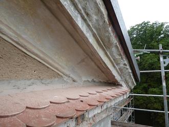 Außerdem erklärte der Architekt Herr Baldauf, welche Probleme es mit der Abdeckung aus Biber, die Anfang der 1990er Jahre erfolgte, gibt (Feuchtigkeitseintritte und falsche Abflussrichtungen bei auftretendem Regen). In Abstimmung mit der Denkmalpflege werden nun die Biber abgebrochen und alle Verblechungen in Kupfer ausgeführt.