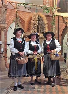 Am 31. Tag der Deutschen Einheit fand in diesem Jahr das 30. Landeserntedankfest im Klosterdorf Dobbertin statt. Mit dabei waren auch Landfrauen aus Grimmen. Denn wir hatten sozusagen die Erntekrone im Gepäck. Es ist schon eine schöne Tradition, dass die Landfrauen des jeweiligen Landkreises die Erntekrone, als Symbol der Ernte, für das jährliche Landeserntedankfest binden. Dass wir da „Nachbarschaftshilfe“ für den mecklenburgischen Kreis Ludwigslust-Parchim leisteten, war selbstverständlich. Aber eigentlich hatten wir mit den Erntekronen in unserer Region in diesem Jahr genug zu tun. Inzwischen haben wir viele Anfragen von Kirchen und Vereinen, behilflich zu sein beim Binden einer Erntekrone. Der uralte Brauch, Erntekronen zu binden, ist Teil des Dankes für das tägliche Brot. So kam es, dass unsere Erntekrone beim Erntedankgottesdienst in der wunderschönen großen Dobbertiner Klosterkirche hing.