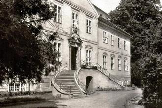 Im OZ-Beitrag hat sich unser Architekt zu den Baufortschritten der Außentreppe geäußert. Wir freuen sich, dass es wieder eine Hufeisentreppe werden wird. Auf der Ansichtskarte aus dem Jahre 1972 sieht man noch die Hufeisenform der Treppe. Nachdem der Giebel über der Treppe in den 70er Jahren abgestürzt war, wurde die uns bekannte Betontreppe geschaffen. Die hinter der Treppe liegenden Kellerfenster wurden damals zugemauert. Sie sind jetzt wieder freigelegt worden.