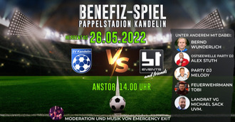 Der SV Kandelin empfängt am Donnerstag den 26.05.2022 um 14:00 Uhr die Mannschaft von BT Events & Friends Team aus Greifswald zu einem Benefizspiel. Neben dem sportlichen Schlagabtausch steht vor allem der gute Zweck im Vordergrund.