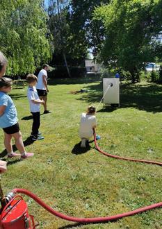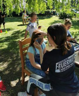 Die Hüpfburg vom Autocenter Grimmen war der Renner. Wir hatten Spiele vorbereitet mit kleinen Preisen, wie Torwandschießen, Büchsenwurf, Eierlauf und Sackhüpfen. Viel Spaß hatten die Kinder mit der Wasserspritze der Feuerwehr. Das Schminken der Kinder übernahmen ganz toll zwei Mädels der Jugendfeuerwehr.