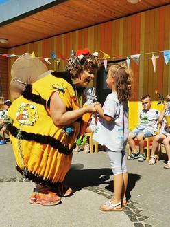 Sie folgten damit der Einladung von Frau Gierke und Frau Wittmis. Die beiden Erzieher haben in Zusammenarbeit mit dem Elternrat, der in seiner Freizeit hierfür sehr aktiv war, das Abschlussfest bis ins kleinste Detail organisiert und sehr gut vorbereitet. Nach einem spaßigen Programm der Vorschüler, in dem sie trotz heißem Wetter sehr schön gesungen, getanzt und gelacht haben, gab es einen Überraschungsgast. Frau Hummel kam ins Hummelnest und erzählte von ihren vergeblichen Versuchen, auch endlich in die Schule gehen zu dürfen. Leider habe es bei ihr nie geklappt,denn sie konnte sich nie die Farben richtig merken und auch das Zählen fiel ihr doch sehr schwer. Da konnten die Kleinen ihr jedoch weiterhelfen und übten spontan mit ihr das Zählen und die Farben.
