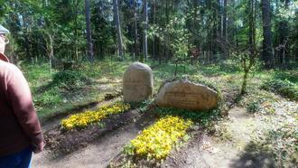 Hügelan finden wir die Gräber, auf denen es gelb blüht. Auf zwei Findlingen sind die Namensschriftzüge von Erwin und Eva Strittmatter eingearbeitet. Nur zehn Schritte entfernt ist das Grab von Sohn Matthes, dem Matthi mancher Strittmatter-Episode, der wie sein Vater 1994 starb.