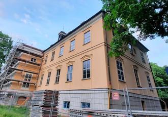 Fangen wir außen an: Der Westflügel des Schlosses hat schon sein endgültiges Aussehen. Im Mai fiel das Gerüst. Schauen Sie sich einmal den Westgiebel an - die Blindfelder sind ein Hingucker. Mit etwas Phantasie kann man sich jetzt auch vorstellen, wie das Schloss als Ganzes von außen aussehen wird.
