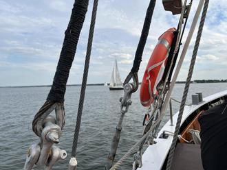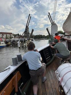 Das regelmäßige Geräusch des 130 PS starken Motors lässt die Passagiere an Bord ein wenig dösen. Erst nach der Passage von Klappbrücke und Sperrwerk in Wieck werden Segel gesetzt, und ohne Motorkraft geht es nun in den Greifswalder Bodden hinaus.