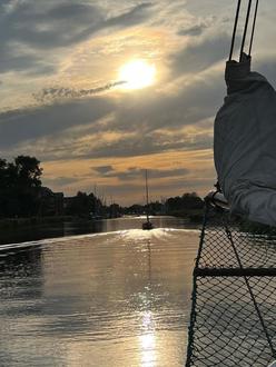 Derweil nähern wir uns wieder der Einfahrt zum Ryck. Die Stunden vergingen zeitlos. Die Sonne erscheint als gelber Fleck hinter diversen Wolkenvorhängen. Dem Abend bzw. dem Sonnenuntergang entgegen fahren wir...