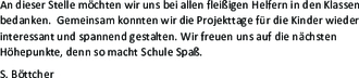 An dieser Stelle möchten wir uns bei allen fleißigen Helfern in den Klassen bedanken. Gemeinsam konnten wir die Projekttage für die Kinder wieder interessant und spannend gestalten. Wir freuen uns auf die nächsten Höhepunkte, denn so macht Schule Spaß.