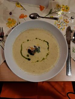Im Saal der Gösselstuv saßen lauter fröhliche Frauen an frühlingshaft eingedeckten Tischen.Mit einem fruchtigen Aperitif,einer freundlichen Begrüßung und einer kleinen Einführung in das Menü ging es dann los. Freundliche, in schwarzer Livree gekleidete Herren servierten ein Drei-Gänge -Essen, nahmen Bestellungen für die Getränke auf, fragten nach,ob es geschmeckt hat oder,ob es noch ein Wein sein darf. Gut umsorgt ließen sich alle das Essen schmecken. Zwischen den Gängen gab es ausreichend Zeit für anregende Gespräche.
