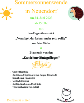 Am 24. Juni 2023 ist es endlich wieder so weit, in Neuendorf wird die Sommersonnenwende gefeiert. Zu Gast ist in diesem Jahr Peter Müller mit seinem Puppentheaterstück „Vom Igel der keiner mehr sein sollte“. Außerdem sorgen die Blasmusiker der „Kandeliner Eintagsfliegen“ für die musikalische Unterhaltung. Ab 15 Uhr geht es los, gefeiert wird auf dem Festplatz hinter der Gösselstuv. Für das leibliche Wohl sorgt der Dorfverein Neuendorf mit Kaffee, Kuchen und Getränken. Weitere Highlights für die Kinder sind eine große Hüpfburg, basteln und spielen mit der jungen Gemeinde sowie die Gelegenheit mit den Kameraden der Süderholzer Feuerwehr ins Gespräch zu kommen. Der Dorfverein lädt alle Einwohner und Interessierten herzlich ein, am 24. Juni 2023 ab 15 Uhr dabei zu sein.