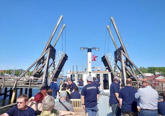 Los ging es am Museumshafen Greifswald mit einer Schifffahrt auf der MS Stubnitz. Bei schönstem Wetter genossen alle die Aussicht, den Wind, die Wellen und auch ein oder zwei Kaltgetränke. Im Wiecker Hafen angekommen, imponierte vor allem die Durchfahrt durch die hölzerne Klappbrücke und das Deichsperrwerk, bevor es zwar nicht auf‘s offene Meer, aber immerhin auf den Bodden ging. Unter strahlend blauem Himmel gab es diverse Fachgespräche, darüber hinaus wurde auch privat geschnackt und „Feuerwehr“ wurde bald zum zweitrangigen Thema. Der Kapitän machte seine Sache prima und auf „ruhiger“ See durften die Kinder auch mal das Steuerrad übernehmen. Nach 2 Stunden kamen wir dann wieder im Hafen in Wieck an und steuerten unseren nächsten Höhepunkt des Ausflugs an. Obwohl das nicht ganz korrekt ist, denn eigentlich waren es sogar 2 Höhepunkte. Unser Wehrführer Torsten Schwebke hatte eine Führung in der Eldenaer Bockwindmühle organisiert. Da wir aber eine „ordentliche“ Truppe waren, die das Fassungsvermögen der Mühle mehr als gesprengt hätte, teilten wir uns auf und während die eine Gruppe sich von Winfried Köpp vom Eldenaer Mühlenverein die Geschichte und Technik der Mühle erzählen ließ, begab sich die 2. Hälfte in die nahegelegene Kunstscheune und widmete sich der gestalterischen Kunst. In der Scheune gab es eine Vielfalt von Gemälden in unterschiedlichen Techniken und Größen und viele interessante Informationen von Gabriele Köpp. Das ein oder andere Motiv erinnerte uns sehr an die gerade stattgefundene Seefahrt. In der Mühle erfuhren wir viele technische Details über Mühlen im Allgemeinen und natürlich im speziellen auch über die Eldenaer Mühle. Beeindruckend waren vor allem die großen Zahnräder, die vollständig aus Holz gefertigt sind. Einige Männer durften sogar Hand anlegen und mal den Wind simulieren und das Mahlwerk in Gang setzen. Leider war es nicht möglich, die gesamte Mühle zu drehen, denn auch das musste zu aktiven Zeiten wegen der Anpassung der Windrichtung möglich sein. Und zwar mit reiner Manneskraft - hätten Sie das gewusst?