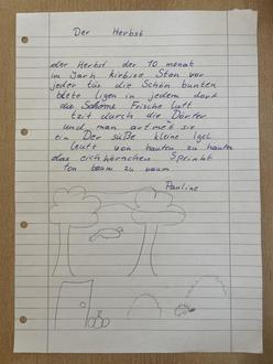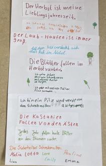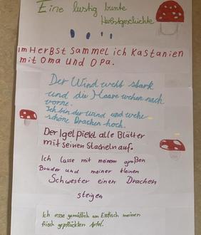 Bei unserer nächsten Begegnung haben sie mit Schlagwörtern, die den Herbst umschreiben, eine bunte lustige Herbstgeschichte entworfen und ihren Vorstellungen entsprechend durcheinander gewürfelte Sätze zusammengefügt.