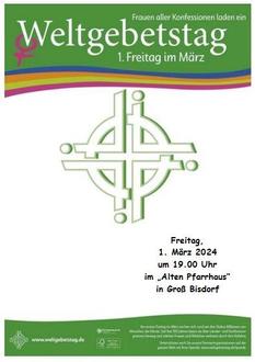 Sie sind herzlich eingeladen am Freitag, den 01. März 2024, um 19:00 Uhr ins Alte Pfarrhaus nach Groß Bisdorf zum Weltgebetstag. In diesem Jahr steht er unter dem Motto „... durch das Band des Friedens“. Die Frauen aus Palästina haben die Liturgie gestaltet. Beginnen werden wir mit einem Bildervortrag über Land und Leute. Danach folgt die Liturgie mit Texten und Gesang. Im Anschluss daran gibt es wieder kulinarische Köstlichkeiten aus Palästina. Wir freuen uns, wenn Sie dabei sind.